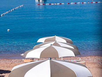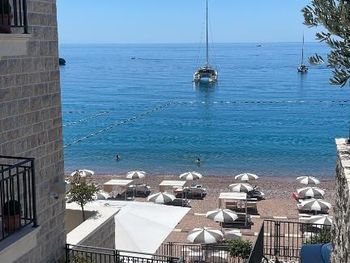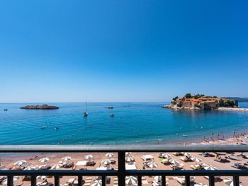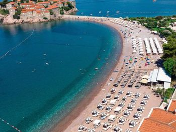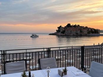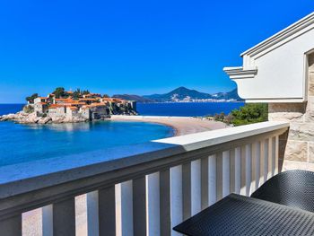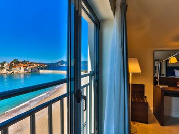 Прекрасный вид на Свети Стефан. Оч вкусный и разнообразный завтрак. По вечерам в ресторане живая музыка. Отличные итальянские лежаки на пляже.