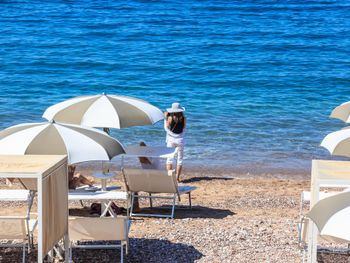 Пляж с неудобным очень заходом в воду, если пройти правее на public beach заход комфортнее и вода, как мне казалось, теплее. В окрестностях нет вкусных ресторанов , или дорого и невкусно или просто невкусно. Чистота на 4ку