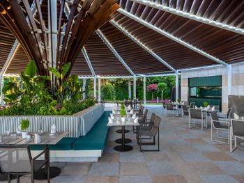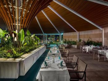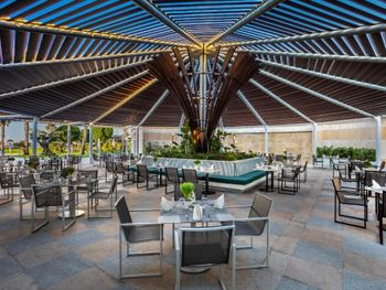 Очень зеленая территория, отель прямо стоит в лесу. 2 подогреваемых бассейна на территории, хороший спа, кухня отличная, уборка на 4, зона Санторини 16+ и ресторан отличный, пирс тоже классное место отдыха