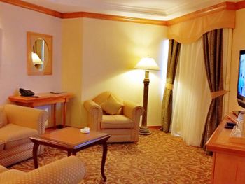 Заплатили через Букинг за представительский номер, в отеле дали обычный стандарт, аргументировав это тем, что других номеров нет, хотя стоимость сняли как за представительский. На букинге указана стоимость налогов и сборов, по факту, в отеле снимают больше, возможно букинг не учитывает туристический налог и ещё что-то. В номере не предоставляют чайники и чайные принадлежности, хотя на сайте указано, что все есть. Только два больших полотенца и полотенце для ног. У бассейна полотенец нет, говорят, используйте те, которые в номере. Горячую воду в номер для кофе приходилось заказывать через ресепшн. На утро второго дня ждали воду час. На ресепшн сотрудник откровенно смеялся и говорил, что в отеле проблема с горячей водой. На требование позвать ген.менеджера сказал, что у нее выходной, что в итоге оказалось не правдой. После длительных разбирательств на второй день поздно вечером нам предоставили номер Джуниор, который разительно отличался от предыдущего. Номер замечательный, очень большой с чайником и тремя комнатами ( до утра следующего дня). Странно было только то, что на просьбу принести халаты, нам отказали, сказав, что отель не предоставляет такую возможность, хотя в обычный стандарт халаты нам по просьбе принесли. На третий день с нами пообщалась ген.менеджер и сказала, что воду приносить в номер не должны и горячая вода есть на первом этаже. Тоже странно, отель не три звезды, мы брали машину напрокат и успели за время отпуска пожить и в другом отеле Дубая в центре и в Шардже, и в Фуджейре, и в Рас Аль Хайме, и в Хатте, нигде не было никаких проблем.Этот отель взяли из-за близости к аэропорту. Ген.менеджер была очень мила и мы продлили номер ещё на два дня, до отлёта. Чайник нам дали и проблем больше не было.Еще один момент- русских каналов нет.