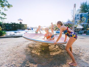 Нет спусков для колясок, высокие перепады при выходе из здания(аналогично и в апартаментах), на территории крутые мосты, что так же не комфортно с коляской, утром на пляже НЕТ свободных лежаков, люди бегут занимать ругаясь и воруя их друг у друга, скидывая полотенца, хотя места поставить дополнительные новые достаточно, добираться на пляже на паромщике, что тоже не всегда комфортно, он бывает переполнен, приходится ждать его, один магазин в шаговой доступности где постоянно толкучка народа и часто не бывает товаров, до прогулочной зоны идти мин 20, с колясками не удобно, обочина узкая и не ровная, развозка только до начала улицы, а далее все равно топать прилично,