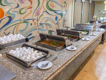 На завтраке, очередь за омлетом и блинчиками ждали 40минут, при заселении просили денег за якобы побольше номер, хотя я такой и оплатил, на ужин попались несвежие салаты, мы с женой отравились, экономия в отеле во всем даже напиток юпи,в баре одна вода была, отель подуставший.
