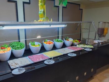 2-3 вида фруктов, основные овощи есть все.В нарезанном обычно виде.