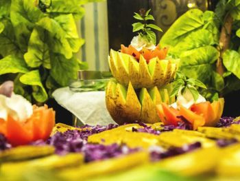 2-3 вида фруктов, основные овощи есть все.В нарезанном обычно виде.