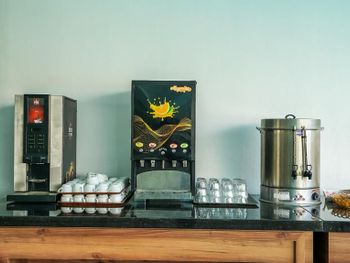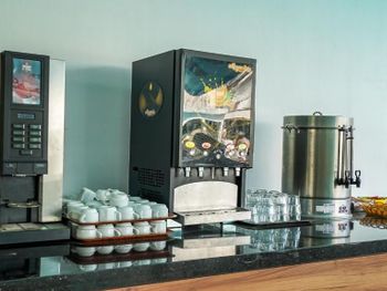 Есть чай, кофе, вода и соки практически круглосуточно - наливаете сами.