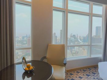 Панорамное окно в номере снаружи в пыли, от этого вид на Бангкок не очень.