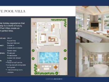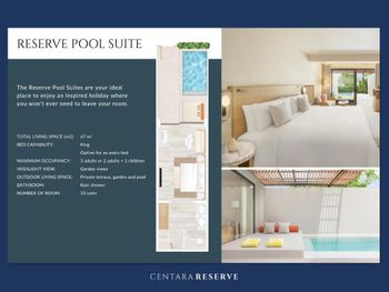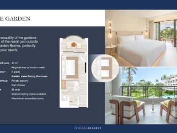 В этом уединенном месте на берегу моря практикуется индивидуальный подход к каждому гостю. У путешественников есть необычайно богатый выбор вариантов размещения, включая эксклюзивные люксы, виллы с услугой Reserve Hosts (дворецкие из штата отеля Centara), номера с выходом к бассейну, виллы с видом на океан. Гости могут проводить время не только в уединении своего номера, но и отправиться на поиски новых впечатлений, например, посетив сеанс качественной спа-процедуры или попробовав уникальные блюда, которые не похожи ни на что другое в островной кухне.