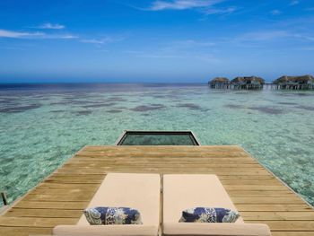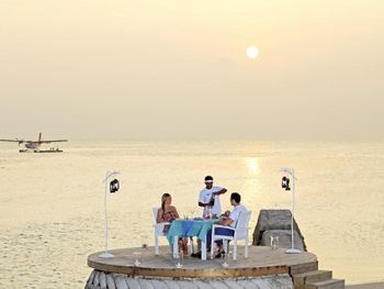 Перелет хорошо организован, мы прилетали из Абу-Даби в 14:00, я прям парился что опоздаем на вылет (первый раз на Мальдивах), в аэропорту встретили и отвезли до аэропорта с гидросамолетами, там предоставили доступ в лаунж. И мы вылетали на остров аж в 17:30, ждали прилет других туристов )) лететь минут 30-40. Вилла супер! Жили в вилле deluxe, потом апгрейднули до two bedroom со своим бассейном. В принципе делюкс пойдет, но мы летали я, жена, взрослый ребенок (18 лет) и сын мелкий (1,3 года). Так вот, в делюксе на втором этаже находится большая кровать, а мелкий как только просыпался сразу вскакивал с кровати и был высокий риск, что он улетит с лестницы ) Поэтому мы апгрейднулись и уже спали на первом этаже ) А так обе виллы отличные, выходишь и сразу пляж. Отличная терраса и там и там, можно сидеть вечерком, курить и смотреть на море ))) Обслуживание было лучше в делюксе, три раза в день приходили на уборку, да песок выметали и воду подливали в ногомойку ))) Питанию я считаю нужно уделить особое внимание, это превзошло все мои ожидания ))) Живем в Москве и дома не готовим (извините), так вот, кухня на острове прям на уровне хорошего московского ресторана. Мы были 9 дней и жили по системе «Все включено» (Al), всего на острове три ресторана, один основной со шведским столом и два по меню. Если вы идете в рестораны по меню, то в систему Al входит 1 закуска/салат/суп, 1 основное блюдо и 1 десерт ) Ну этого достаточно ) Перепробовали все, просто супер! В основном ресторане кормят еще лучше, мне показалось ))) Фруктов много, я просто подходил к повару и просил у него те фрукты, которых не было на столе ) и он мне это по-братски давал )) арбуз, манго, маракуйя, папайя )) очень вкусный холодный чай и холодный кофе, сами готовят ) За алкоголь ничего не скажу, не употребляю, но точно знаю что в Al входит вино/игристое/крепкие напитки.