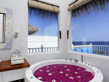 Началось все с того, что нас не встретили в аэропорту( мы сами еле-еле отыскали стойку отеля (сотрудника там не было) и ждали мин 40 пока хоть кто-то за нами придет Затем нас зарегистрировали на гидроплан и посадили на микроавтобус, который довез нас до терминала вылета, тоже не проводив , в терминале мы сами искали где ожидать наш рейс( оказывается есть общий лаунж и там можно разместиться) В отеле нам очень понравилась вилла на воде с видом на закат, большая гардеробная, огромная ванная комната с джакузи с видом на океан, терраса , убирались хорошо 2 раза в день , но очень не хватало зонтиков на террасе При заезде нас ждала в комплимент бутылка шампанского и сладости Остров небольшой, можно обойти мин за 15 Достаточно хороший фитнес зал, с водичкой, холодными полотенцами и вкусными яблочками) Из недостатков: в принципе отель неплохой, но конечно не на 5*, чувствуется что уже старенький и много мелких недочетов таких как: нет лежаков на пляже, кроме тех которые относятся к виллам на пляже ( те если мы пришли позагорать с виллы на воде, мы можем расположиться только на песке -это странно Около основного бассейна вообще нет линии пляжа , что тоже неудобно Несколько раз за неделю не работал основной ресторан на ужин, и об этом не было никакого предупреждения, кроме объявления на самом входе ресторана, когда мы пришли ужинать и никакого описание куда нам тогда идти -сами узнали у официанта в баре, что можем тогда поужинать в тайском или итальянском ресторане ( где меню намного меньше основного, а с детьми думаю это совсем неудобно) В основном ресторане еда средняя , в основном индийская кухня, острая, но есть детский стол на котором мы иногда питались тк там хотя бы не остро ) Зато входят 1 алкогольный и 1 безалкогольный напиток на завтрак и ужин ( утром шампанское (кислючее) а на ужин можно взять коктейль Фруктов очень мало и в основном не зрелые : арбуз, дыня, яблоки, бананы, гуава В тайском ресторане достаточно вкусно, итальянский тоже неплохой Каждый вечер на...