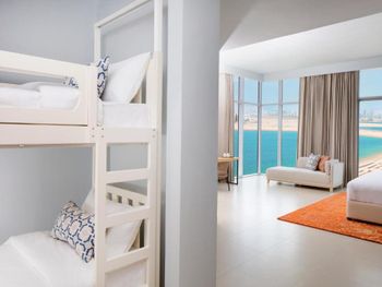 В семейном номере 2 кровати 130 см шириной (ребенку большая, взрослым маленькая); чистота средняя; полотенце для ног дали только на четвертый день; звукоизоляция слабая; постоянно самолеты летают на взлет/посадку; с соседним номером была смежная дверь, которую соседи зачем-то постоянно дергали. Напитки в half board входят только на завтраке, на обеде или ужине даже вода платно. Магазинов рядом нет. В город только на такси, до центра Дубая по пробкам не меньше минут 40. В море у берега встречаются большие морские ежи и медузы.