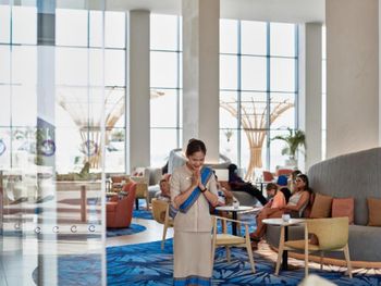 Благоустройство в отеле на высшем уровне, особенно развлечения для детей, ребенок в восторге. Просторные номера с панорамой, новый чистый просторный отель. Если приехал раньше чек ина, то есть лаунж.