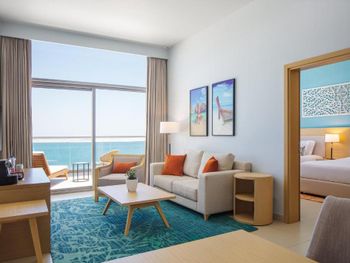 В семейном номере 2 кровати 130 см шириной (ребенку большая, взрослым маленькая); чистота средняя; полотенце для ног дали только на четвертый день; звукоизоляция слабая; постоянно самолеты летают на взлет/посадку; с соседним номером была смежная дверь, которую соседи зачем-то постоянно дергали. Напитки в half board входят только на завтраке, на обеде или ужине даже вода платно. Магазинов рядом нет. В город только на такси, до центра Дубая по пробкам не меньше минут 40. В море у берега встречаются большие морские ежи и медузы.