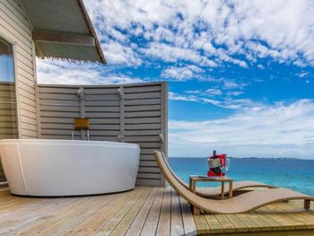 На водной вилле очень маленькая веранда, одно неверное движение и вы упадёте. Лестница в воду не очень удобная. Зачем-то сделала последняя ступенька, которую ты не видишь. Рассекла колено, когда выходила из воды. Дно очень каменистое. Тапки обязательно.