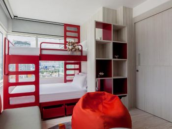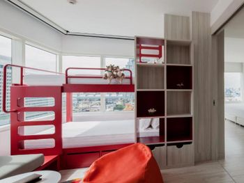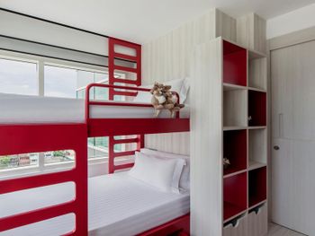 Брали семейный номер - двое взрослых и двое детей (11 и 6 лет). Очень быстрое заселение. номер представляет собой студию с тремя окнами - в спальне, ванной и детской. Ванна находится посередине. Детская представляет собой небольшую комнату, в которую вмещается двухъярусная кровать и журнальный столик. В номере при заселении отель предоставил следующие комплименты - детям по киндер сюрпризу (они были в игрушечных кенгуру), тарелка фруктов и четыре маленьких слоника из ткани. Номер тихий, шуму с улицы не слышно. Жили на 17 этаже. спасибо персоналу за уют и гостеприимство.