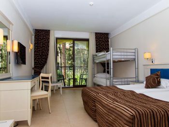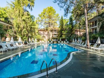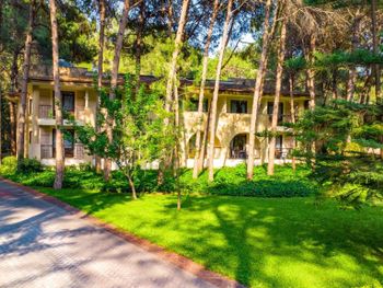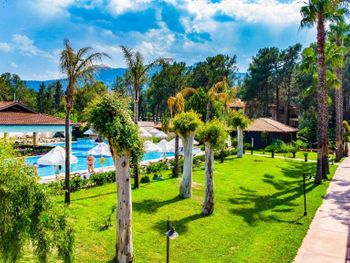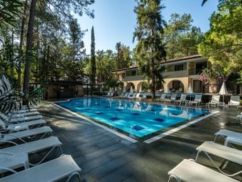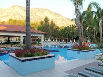 Расположение отеля. Отель отлично распланирован. Шумные места возле пляжа, все корпуса внутри территории и нет ни одного корпуса с видом на улицу. А почти все отели в Бельдиби, даже самые дорогие, такие номера имеют. Территория очень зелёная, сосны, араукарии, цветы - прекрасно. Ощущение, что живёшь в лесу. Тихо, пахнет соснами. Отличный пляж, есть пирсы для захода с лестниц. Вид на пляже великолепный. Очень хорошие бассейны. Нас было трое. Хотели жить в двухкомнатном номере или в двух номерах, но не было мест. Жили в стандартном трехместном номере, было не тесно. У всех хорошие кровати. Еда отличная. Все очень вкусно, разнообразно. Всегда была рыба, курица, мясо. Овощи, фрукты - само собой. Получили удовольствие от отдыха в отеле, по соотношению "цена-качество" один из самых лучших