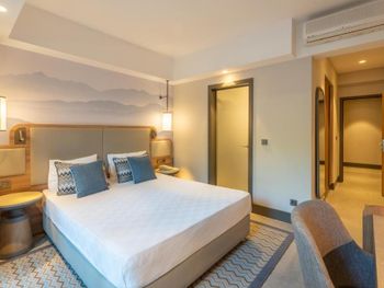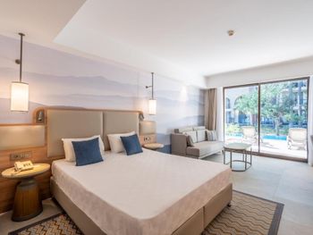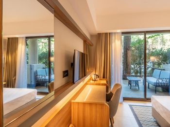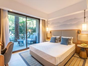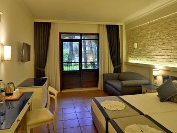 Жили 2 ночи как стартовый релакс с all-inclusive перед другими точками Турции, дольше уже будет скучновато. Всё очень понравилось. Приятный отель. Большая территория, есть где пройтись в дневную жару. Жилые корпусы в сосновом лесу, с утра поют птицы, окна выходят с видом на лес, находятся у тени и в течении дня солнце не жарит в окно. На территории бегает много птичьей живности, дети были в восторге, бегали за цыплятами, пару раз их ловили, находили кладки яиц. Есть отдельный тихий бассейн, где запрещен вход с детьми для ценителей тишины. В море особо не ходили, у бассейна стандартный бар с пивом и коктейлями алко/без. Рядом снек бар с хорошим кофе из кофемашины и бариста, качественными вкусняшками. Бассейны чистят по вечерам, у детей не было никаких проблем из-за бассейна в плане здоровья. Дочь чувствительна к хлорке, хлорированность была в норме. Вода не холодная, но и не горячая, для бассейна самое то. По еде всё было вкусно, разнообразно. Салатная зона, овощная, фруктовая, сладкая, горячая и хлебная - всегда всего в достатке, сыты и довольны. Для любителей ЗОЖ и физикл - всегда была отдельно приготовленная вареная куриная грудка. Приехали к 4 утра, доспали в лобби на удобных диванах, заселение в 13:30. Ребята ранним утром нам сразу повязали браслеты и разрешили сходить на завтрак. После выезда тоже никто прям не выгонял, браслеты не забрали и можно было сходить на обед.