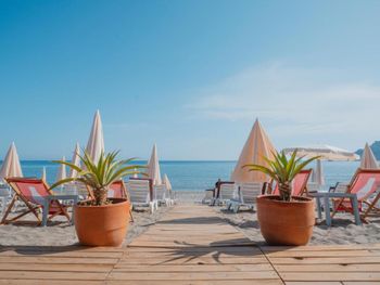 Отель расположен на первой линии, но сразу за дорогой, через которую вёл регулируемый наземный пешеходный переход. У отеля есть СВОЙ пляж оборудованный мягкими лежаками, зонтами и столиками. ВСЁ БЕСПЛАТНО для постояльцев отеля. Пляжные полотенца выдают раз в день на рецепшен отеля. На пляже есть фудсервис и ресторанчик: стильно и вкусно. Пляж песчаный, но есть чуток мелкой гальки и отдельные каменные плиты на входе в воду. Тапочки для кораллов не нужны!