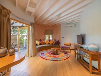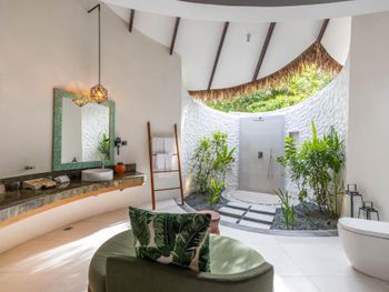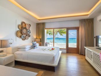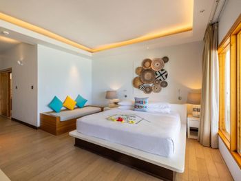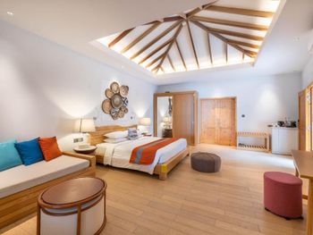 Гостям предлагаются комфортабельные люксы с потрясающим видом на океан, тростниковым потолком и полом из массива дерева. В числе прочих удобств — просторная гостиная зона и собственный балкон.