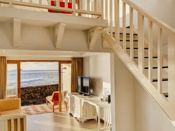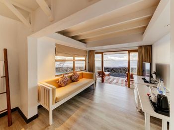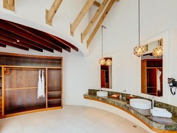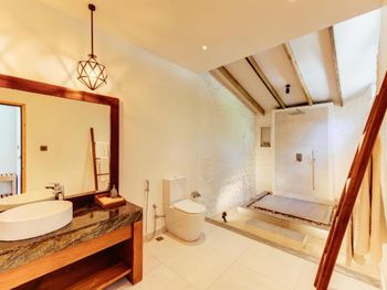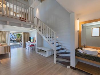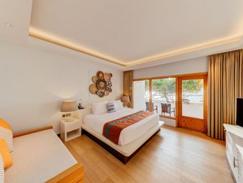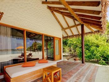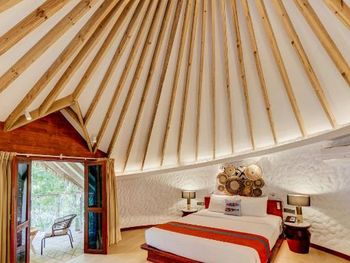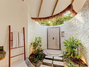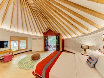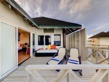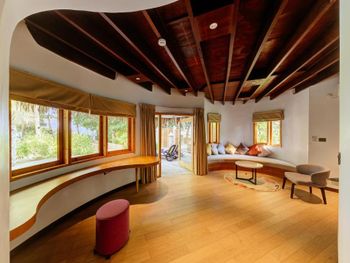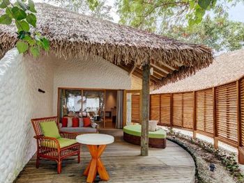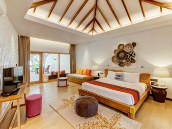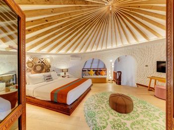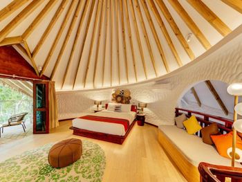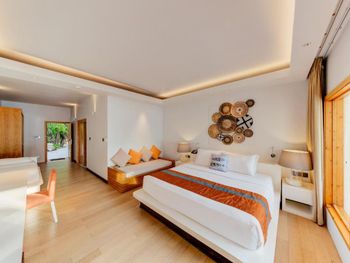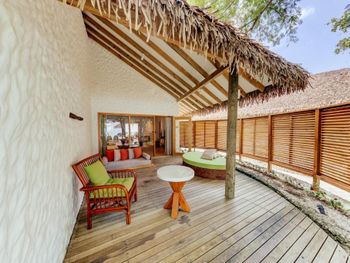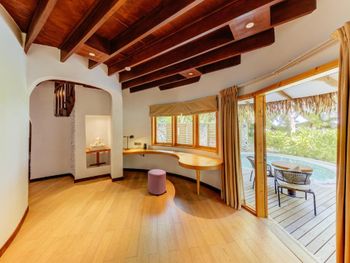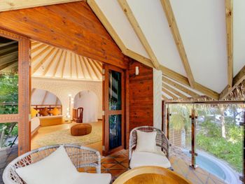 Гостям предлагаются комфортабельные люксы с потрясающим видом на океан, тростниковым потолком и полом из массива дерева. В числе прочих удобств — просторная гостиная зона и собственный балкон.