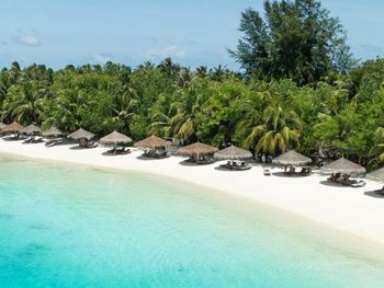 очень небольшой остров -отель , все, как и у всех подобного типа отелей ,компактно . но нет свободных шезлонгов . номера двухэтажные выходят на берег, где нет волногасителей и от этого купаться можно только на противоположной стороне острова , куда и приходят все !! гости . песок в перемешку с кораллами , ходить просто босиком не всегда комфортно .