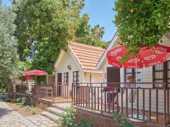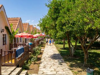 Расположение отеля идеальное - непосредственно на берегу моря, от бунгало реально 100 метров до пляжа. Сам пляж песчаный и пологий вход в море. Прекрасно для детей любого возраста. Огромный просто огромный плюс - собственный пляж, всегда найдете лежак с зонтиком. Очень отзывчивый и внимательный персонал. территория отеля уютная, домики в апельсиновом саду, столики и диванчики в тени деревьев. Вообще локация просто шикарная - 10-15 минут пешком по берегу до центра старого Сиде, где музеи, архитектурные древности, кафе и бары, магазинчики и вообще "движуха"). Большинство людей приезжают туда на такси, пешая доступность большое преимущество. В самом отеле очень тихо и спокойно.