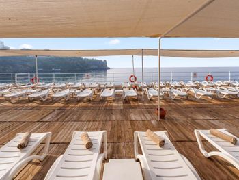 Напротив вида на море установили кран, для замены нижнего пляжа, что испортило вид на море, который не работал 4дня. У бассейна вообще нет зонтов от солнца, в жаркую погоду многим будет не комфортно..