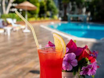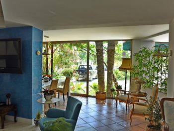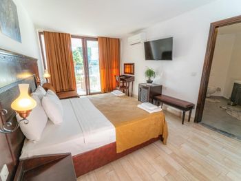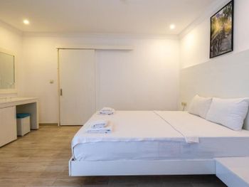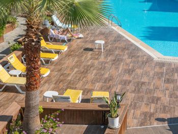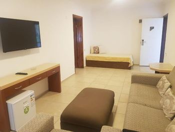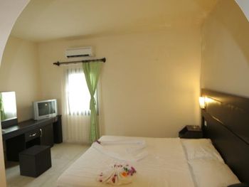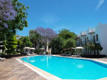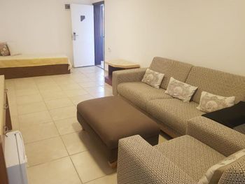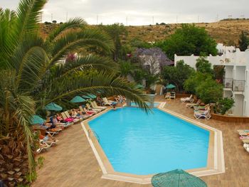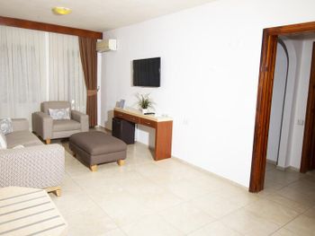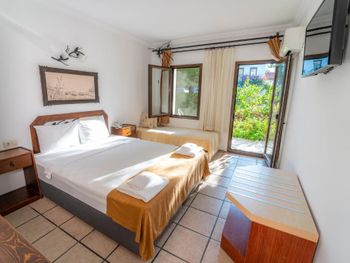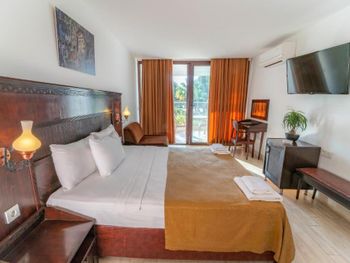 отличное расположение: через небольшую дорогу находится общественный пляж, кафе, за углом магазин. Не нужно преодолевать никаких спусков и подъёмов; - на территории есть большой бассейн с лежаками, просторное лобби; - в комнате кондиционер, холодильник, двуспальная и односпальная кровати, в ванной гель для душа, шампунь и мыло; - наш номер был на 1 этаже, из которого можно было выйти прямо к бассейну; - в целом приветливый персонал.