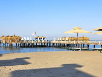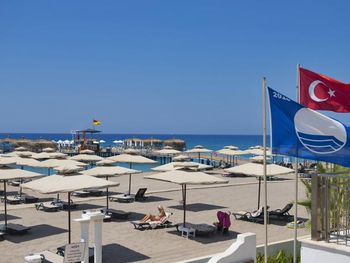 Пляж достаточно широкий, но оборудовано только 2/3, поэтому места после позднего завтрака найти проблематично.