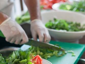 Салаты: нарезанные помидоры, огурцы, капуста и морковка, зелень.