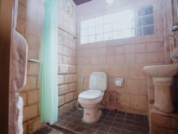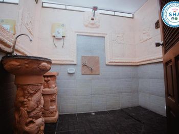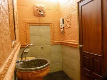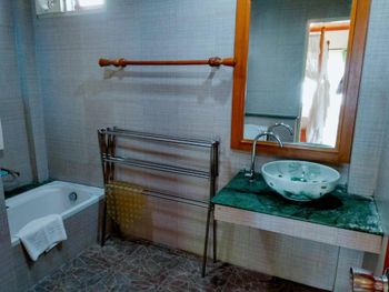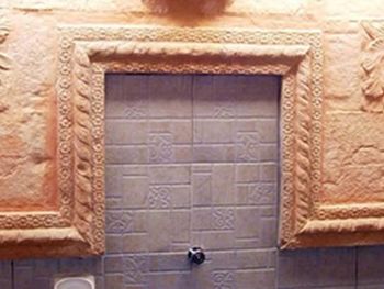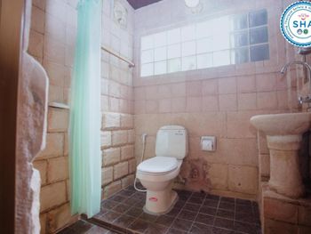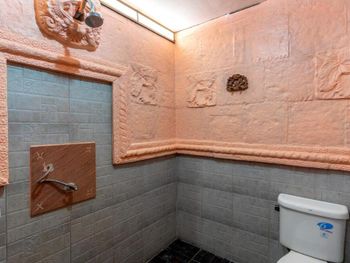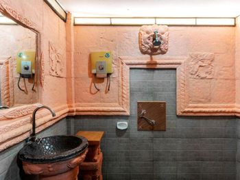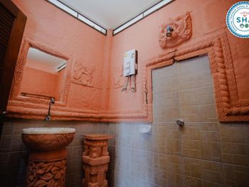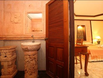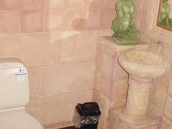 В виллах стены душевой и раковина выполнены из бетона с элементами барельефов, которые все в пыли, паутине и листьях. Зеркало и светильник не мыты как минимум сезон. Ни