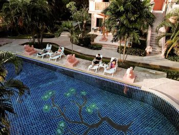 Отельные шезлонги занимают людей с других отелей.Лучшие места в тени дерева для таких платных туристов занимает сам работник смотритель за бассейном и пляжем,выдаёт им отельные полотенца без ограничений.Тут же в тени разместили массажный салон.