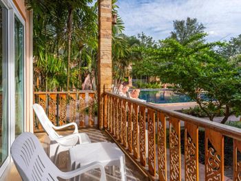 Красивая зеленая территория, с балкона наблюдали за белками на деревьях, гекконами, летучими мышами. Очень понравилось.