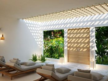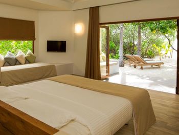 Все номера окружены зеленой растительностью, которая хорошо видна через стеклянные перегородки, отделяющие ванную комнату на открытом воздухе, что само по себе дарит ощущение единения с природой и создает свежий контраст с бескрайними просторами бирюзового моря.