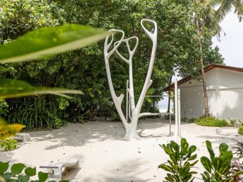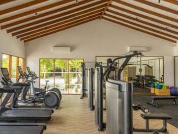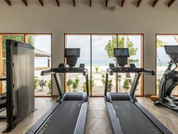 Все номера окружены зеленой растительностью, которая хорошо видна через стеклянные перегородки, отделяющие ванную комнату на открытом воздухе, что само по себе дарит ощущение единения с природой и создает свежий контраст с бескрайними просторами бирюзового моря.