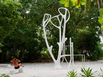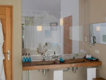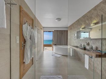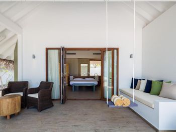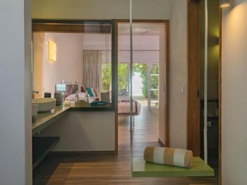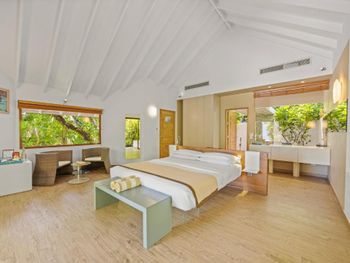 Все номера окружены зеленой растительностью, которая хорошо видна через стеклянные перегородки, отделяющие ванную комнату на открытом воздухе, что само по себе дарит ощущение единения с природой и создает свежий контраст с бескрайними просторами бирюзового моря.