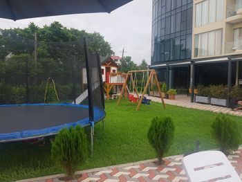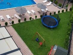 Отель супер. Кровати очень удобные, на полу ковролин, отель новый, балкон широкий с остеклением, видно детскую площадку. Детская площадка с натуральным газоном! (на фото кажется искусственный), батут всегда восстанавливали, когда он ломался. На завтрак можно много чего выбрать, он разнообразный.