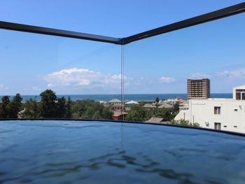 Панорамные окна в номерах, вид на море. Наличие чайника в номере. Недорогой ресторан.