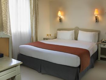 Отель довольно таки не новый, видно что его пытаются поддерживать в нормальном виде, где надо подкрасить. Отсутствие достаточного количества розеток в номере. Приходилось отключать лампы бра в номере чтобы поставить на зарядку телефон, планшет. Для семьи это не очень то и удобно. Тем более если у кровать нет розеток. В ванной иногда не было горячей воды, благо при такой жаре холодной тоже можно принять душ. Может я придираюсь, но я привык чтобы около унитаза был смеситель, а ни каждый раз в душ бегать... Пару слов про еду. Ели чтобы что-то поесть и не остаться голодными.