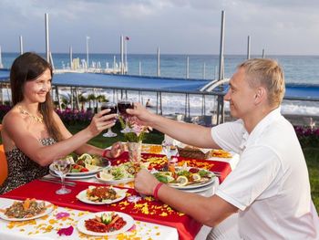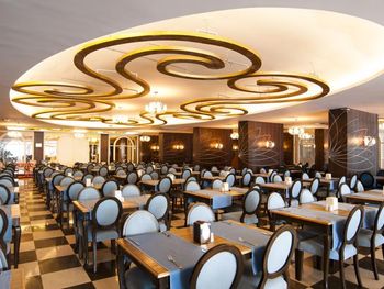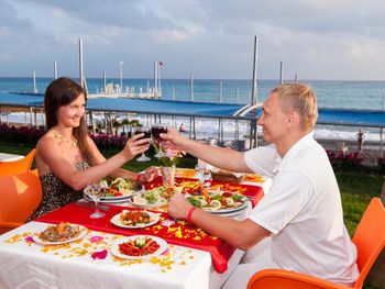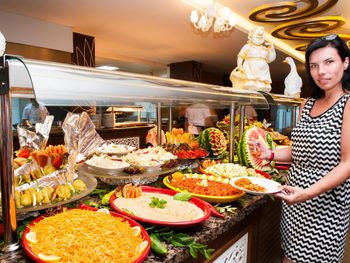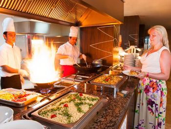 Гостям подают завтрак, обед и ужин «шведский стол» по системе «все включено». В ресторане с обслуживанием по меню можно заказать разнообразные блюда, а в баре — напитки.