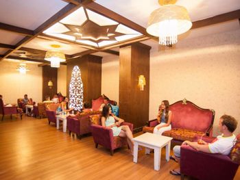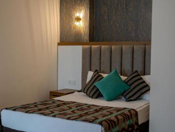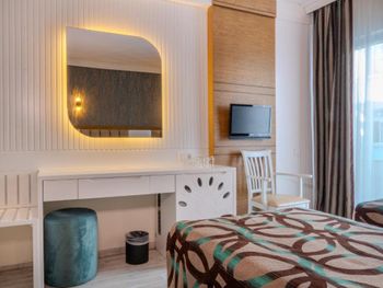В отеле есть парковка, но мест на ней не было,хотя я заранее задавала вопрос о наличии парковки и предупреждала,что будем на машине. Кстати на вопрос мне так и не ответили.Пришлось оставить ее у дороги.Оформление на ресепшн произошло быстро, затем нас попросили подождать человека, который нас проводит до номера, и забыли о нас. Спустя 20 минут, мы сами подошли и напомнили о себе, так как боялись пропустить обед. Нас проводили в номер на пятом этаже, с видом на соседний отель. Лифт ждали долго,это был единственный раз за сутки,когда мы им воспользовались.Все остальное время исопользовали лестницу.Номер на твердую тройку, не грязно, полотенец достаточно, в душе много моющих средств. В мини-баре сок. Кровати старые, но удобные, для укрывания предложены почему-то очень маленькие покрывала, даже одному не очень удобно укрываться, а вдвоем так и вообще нереально.Хотя мы просили номер для двоих с большой кроватью, нам дали номер,рассчитанный на троих. Рядом стояла вторая кровать, взяла покрывало оттуда. В столовой, рестораном это точно не назвать, хаос. Людей много,сложно найти свободные столики, но с едой недостатка нет, всего много и все не вкусное. Из десертов практически одни желе, я такое ранее даже и не видела. Обычно турция славится своей выпечкой. Стаканы в баре грязные, со следами помады. Тарелок много, персонал вытирает их прямо в зале, что позволяет думать, что во время интенсива, посудомоечные машины не используют, ибо из этих машин посуду достают горячей и сухой. Официанты быстро убирают грязную посуду, особой навязчивости ,как написано в отзывах ранее, этом я не увидела. Персонал вежливый. Из плюсов то, что воду можно брать в бутылках без ограничения, также видела, что гости брали фрукты в номер и на пляж. Жесткого контроля нет.