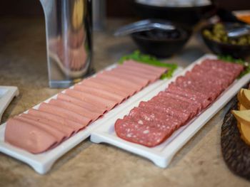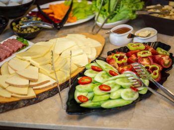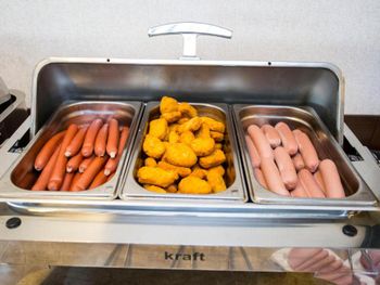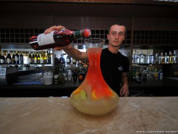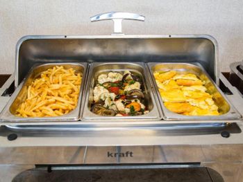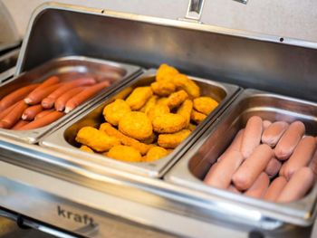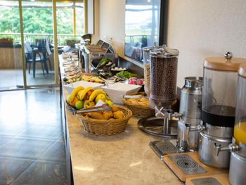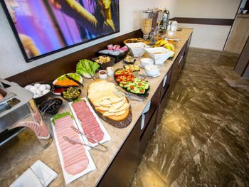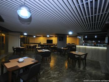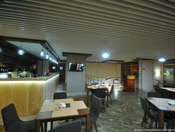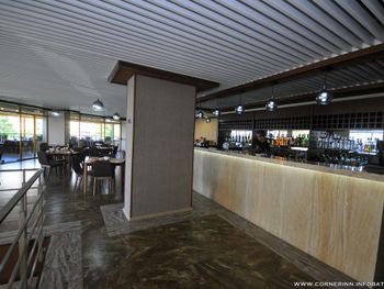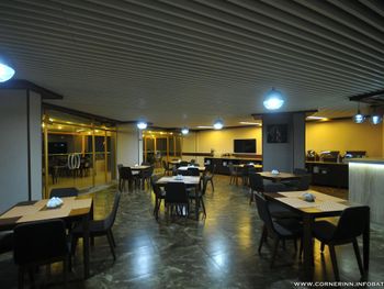 В ресторане подают блюда по меню и по системе «шведский стол». Напитки и закуски можно заказать в баре.