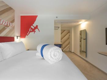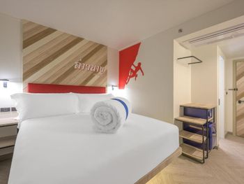 Действительно большая кровать. В номере центральная система вентиляции. Отличное расположение, в пешей доступности всё необходимое. Номер не большой, но довольно удобный, есть маленький холодильник и небольшая зона с плечиками для хранения вещей.