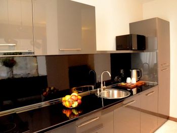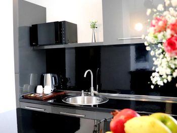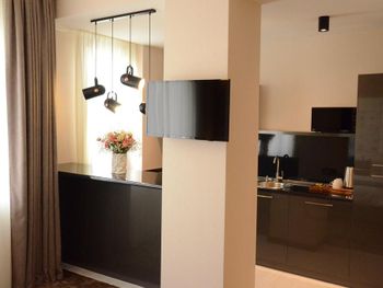Номер просторный и достаточно уютный, оснащён кухней и ванной. Предусмотрена посуда, микроволнлвая печь и даже гигиенический душ в ванной.
