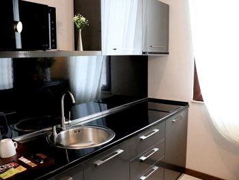 Оборудованная полностью кухня с кофе машиной, чисто, огромная ванна