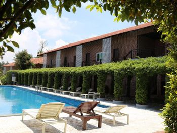 Красивая территория, много зелени, арочная аллея потрясающая, большой бассейн, есть кухня в саду , можно приготовить обед