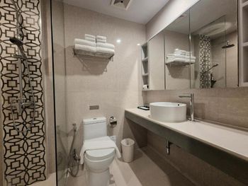Ещё только возвращаемя с отдыха, а чувство разочарования осталось.По пунктам: в номере уборка была ежедневной это радовало, но двери , которые отделяют комнату от ванной в нижней части были покрыты толстым слоем грязи и пыли . Пребывало 2 человека, а постоянно не докладывали либо совсем, либо на одного человека мыло, деток зубных вообще не было, нужно было обращаться к администратору, Шампунь и гель для душа в больших бутылках, туда оказывается доливают после пользования другими постояльцами. Крышка унитаза держалась на одном болте,в номере было очень влажно первые 2 дня, потом персонал открыл вентиляционные отверстия и стало комфортно. Стены тонкие слышно все звуки, постоянно шум с улицы и в самом отеле, как-будто проживаешь в общежитии (грохот ночью, выяснение отношений, стук в двери).У отеля ночью останавливаются машины откуда очень громко звучит роковая музыка.. На 9 этаже, где бассейн и тренировочный зал открытие в 8 часов.,т.е утром до 8 тренировки не возможны , хотя до жары хочется позаниматься , позавтракать и уйти на море. Завтраки настолько однообразные,что я уже знала, что сосиска или ветчина (однажды она пахла кислым) обеспечены ежедневно. Ананас сухой, арбуз не сладкий, бананы не пробовала. А это сезон. В салатных листьях порой попадались пятнышки лежавшей зелени. Выбор блюд очень ограничен. Спасибо большое персоналу на рецепшн, они были очень отзывчивы.По нашей просьбе они поменяли номер на лучший этаж, объясняли как и куда добраться, были отзывы и внимательны.На Букинге не отражено, что требуется депозит 1000 бат. Если планируете отдых с детьми, тут не стоит останавливаться. Зелёной зоны нет и тишины тоже