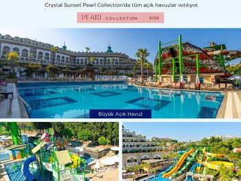 Курортный спа-отель Crystal Luxury Sunset расположен рядом с морем. К услугам гостей собственный песчаный пляж длиной 250 метров, открытые бассейны, 11 водных горок и спа-центр. Отель отличается уникальной архитектурой и работает по системе «все включено», а его название символизирует кристальную чистоту воды в Средиземном море.