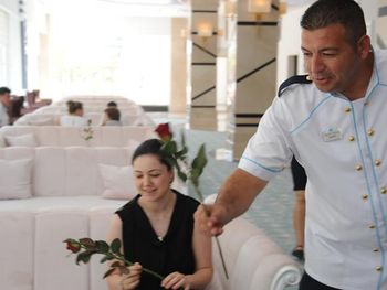 Не вкусное и однообразное питание Отношение персонала, персонал ресторана не говорит по английски, отдают приоритет туристам из турции, которые владеют местным языком. Очень большие очереди из-за персонала, менеджеры плохо справляются со своей работой. Очень много чего закрыто и не работает. Отвратительное шоу вечером. Отель очень старый и давно требует ремонта. Горки работают с ограничением, оборудование старое и выглядит не очень безопасным. Море грязное, на пляже бычки и окурки, вход в море УЖАСНЫЙ, нужны тапки, ну или прыгать с пирса. Мы заплатили за 12 ночей 350 тысяч рублей!!!! отель не стоит своих денег!
