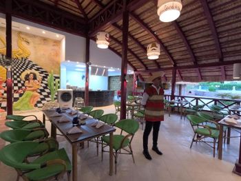 В ресторане не хватало постоянно столиков, так как людей было много, и приходилось постоянно искать столик, ожидая когда его освободят. И после того как сел, то необходимо ждать, когда принесут приборы. А официантов мало на такое большое количество людей, поэтому столы очень часто остаются не убранные после предыдущих людей. Также еще стоит человек рядом с раздачей курицы или мяса, и сам кладет определенное количество.
