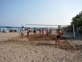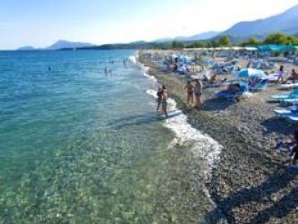 Песчаный и галечный пляжи, лежаки, шезлонги, зонтики.